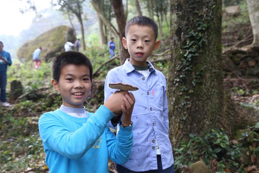 午餐是非盛的灵芝宴,除了野菜,孩子们最喜欢的是用灵芝喂养的灵芝鸡,那汤真鲜啊!也许是活动量比较大,孩子们把满桌菜吃了个精光!饭后稍事休息,我们就开始爬山摘野果,今天收获不小,摘到了锥栗、四照果、木通、冷饭团。而且还爬上了海拔一千多米的泼墨岩,体会了一览众山小的豪迈!
