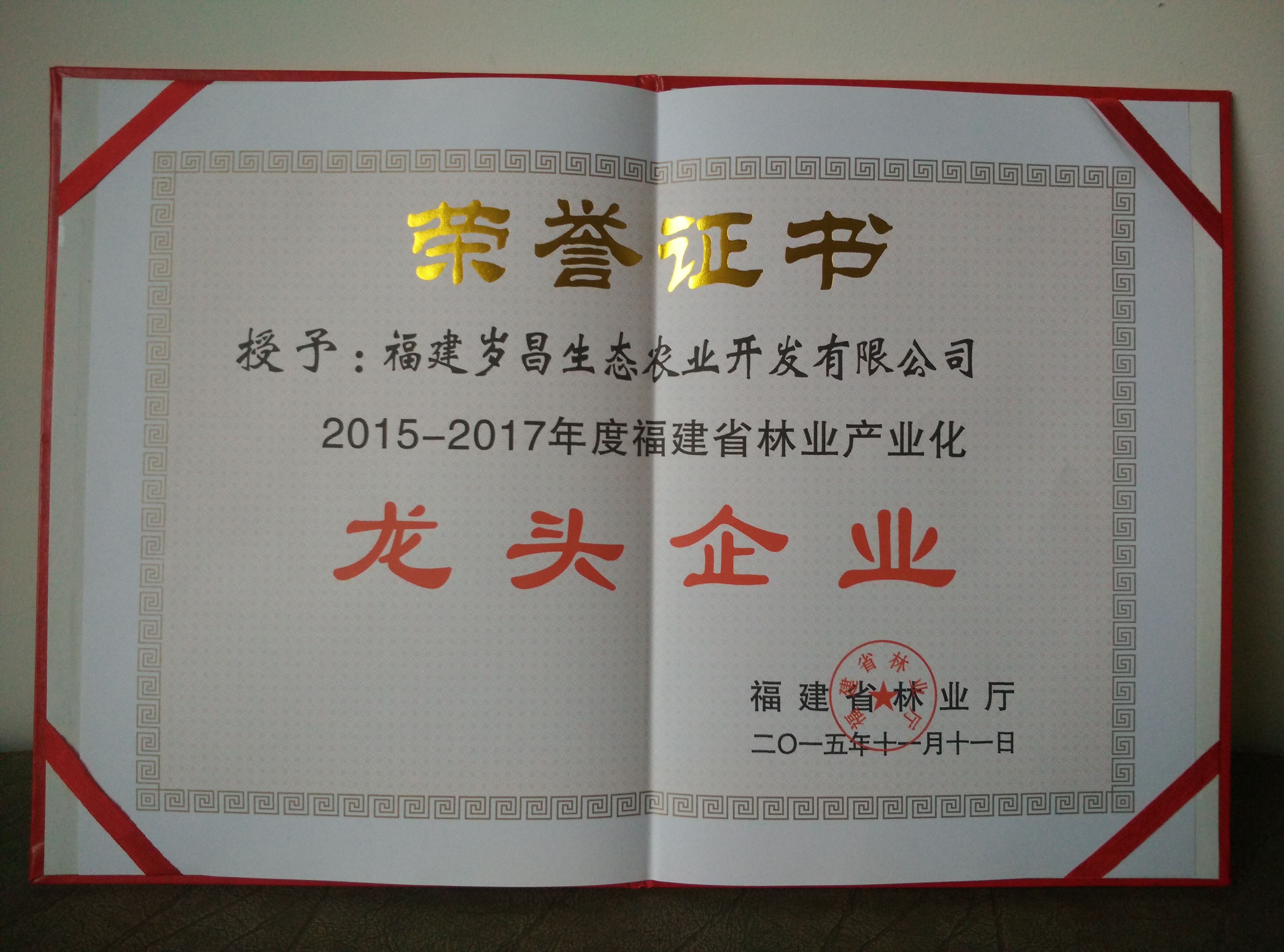 热烈祝贺我司荣获省林业重点龙头企业 发布时间:2017-12-19 16:34 作者:福建岁昌农业 来源:福建岁昌农业 点击: 字号:大中小 上一篇:岁昌生态园举办乡亲员工元宵喜乐会 下一篇:仓山区科技局郑仲局长莅临集团总部参观指导