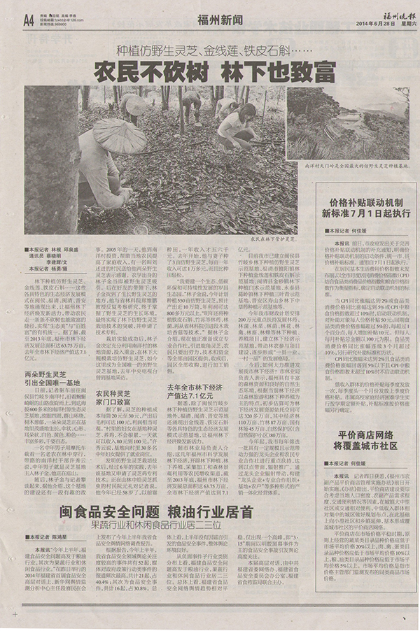 林下种植仿野生灵芝、金线莲、铁皮石斛……这些各具特色的生态经济发展模式在闽侯、福清、闽清、晋安等地涌现出来,让福州林下经济焕发新活力,带动农民走一条条不砍树也能致富的捷径,实现“生态美”与“百姓富”的有机统一。据了解,截至2013年底,福州市林下经济发展总面积达63.75万亩,去年全市林下经济产值达7.1亿元。